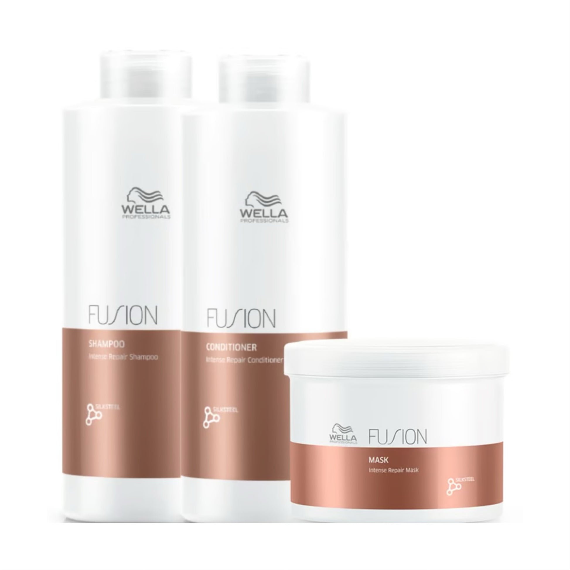 Kit wella fusion se compone de Shampoo 1 litro, acondicionador 1 litro y mascarilla 500 ml. Es una linea profesional para cabello dañado que aporta protección al cabello frente al daño causado por el secador y la plancha y la rotura. Es un producto con aminoácidos de seda que deja el cabello suave y con una mayor resistencia.