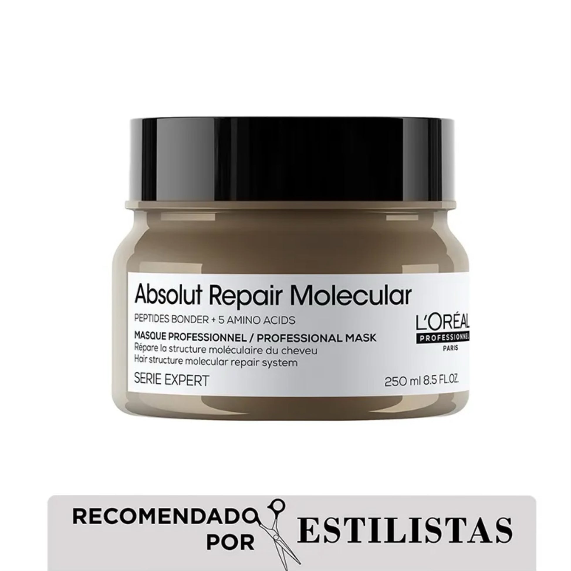 Mascarilla profesional Absolut Repair Molecular con enjuague, formulada con Peptides bonder + 5 Aminoácidos para rellenar las capas moleculares del cabello. Su textura ligera y sedosa inspirada en skincare, restaura la fuerza logrando un desenredo extremo del cabello además de mayor suavidad, brillo instantáneo, disciplina y movimiento, con resultados visibles desde el primer uso. Utiliza la rutina completa de Absolut Repair Molecular y repara 2 años de daño en tu cabello.